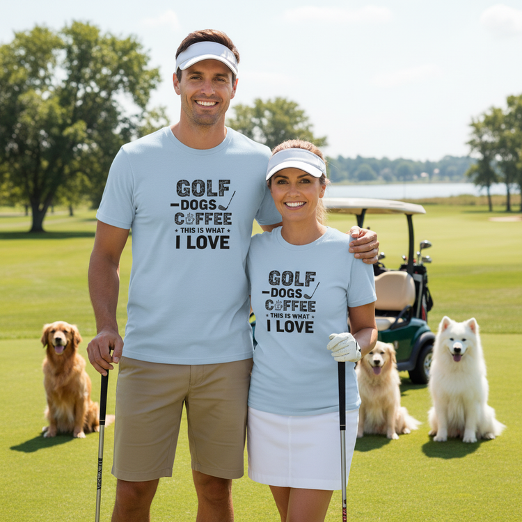 "Golf. Dogs. Coffee. This is What I Love" Heavyweight Unisex Crewneck T-shirt | Gildan® 5000 White